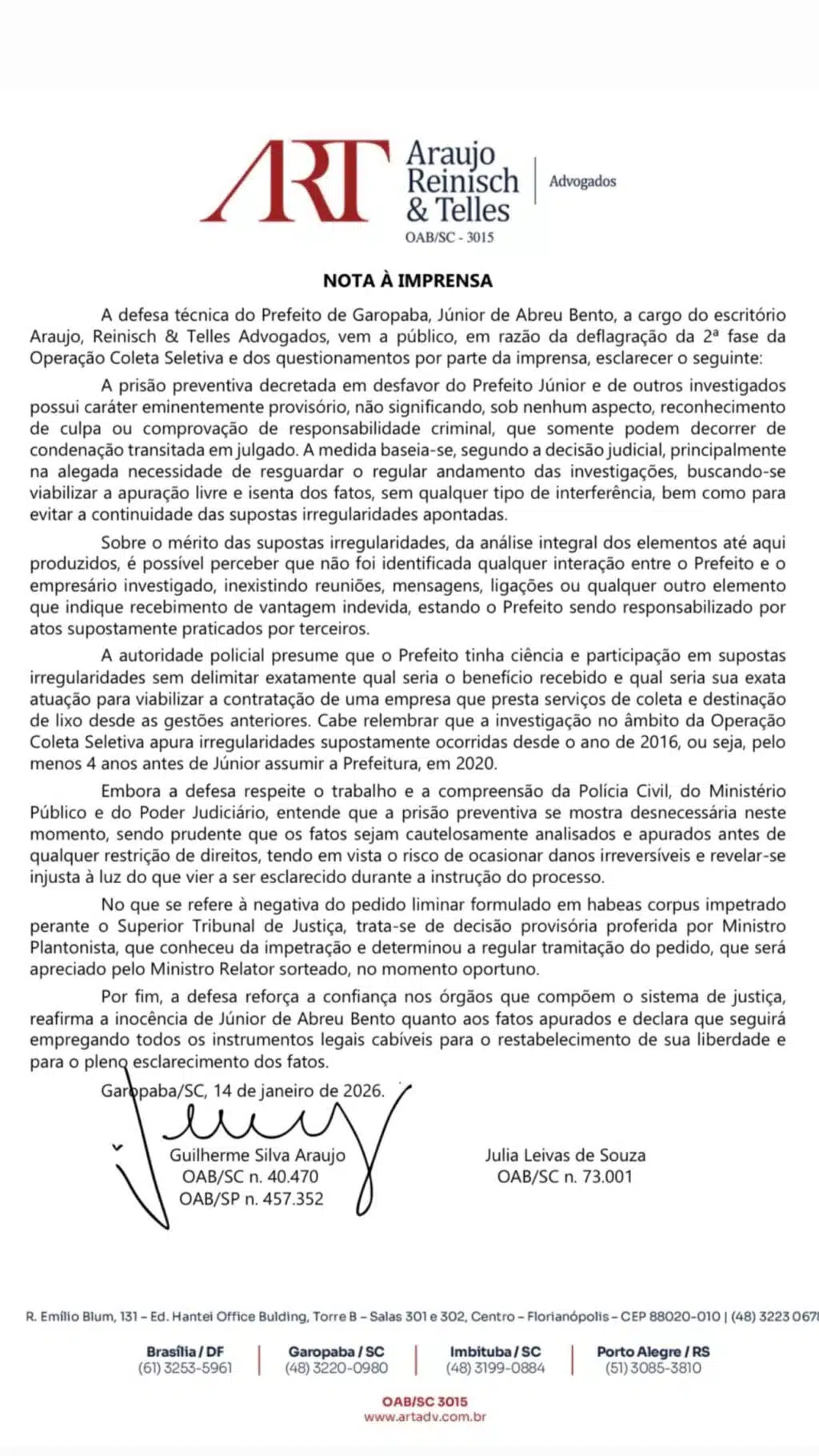 Em nota à imprensa divulgada na quarta-feira (14), a defesa técnica do prefeito de Garopaba, Junior de Abreu Bento, afirmou que a prisão preventiva tem caráter provisório e não representa reconhecimento de culpa ou comprovação de responsabilidade criminal.