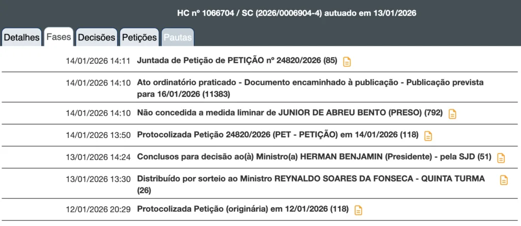 O habeas corpus, registrado sob o número HC 1066704/SC, foi protocolado no domingo (12) e distribuído ao ministro Reynaldo Soares da Fonseca, da Quinta Turma do STJ. A impetração foi apresentada contra decisão do Tribunal de Justiça de Santa Catarina (TJ-SC).